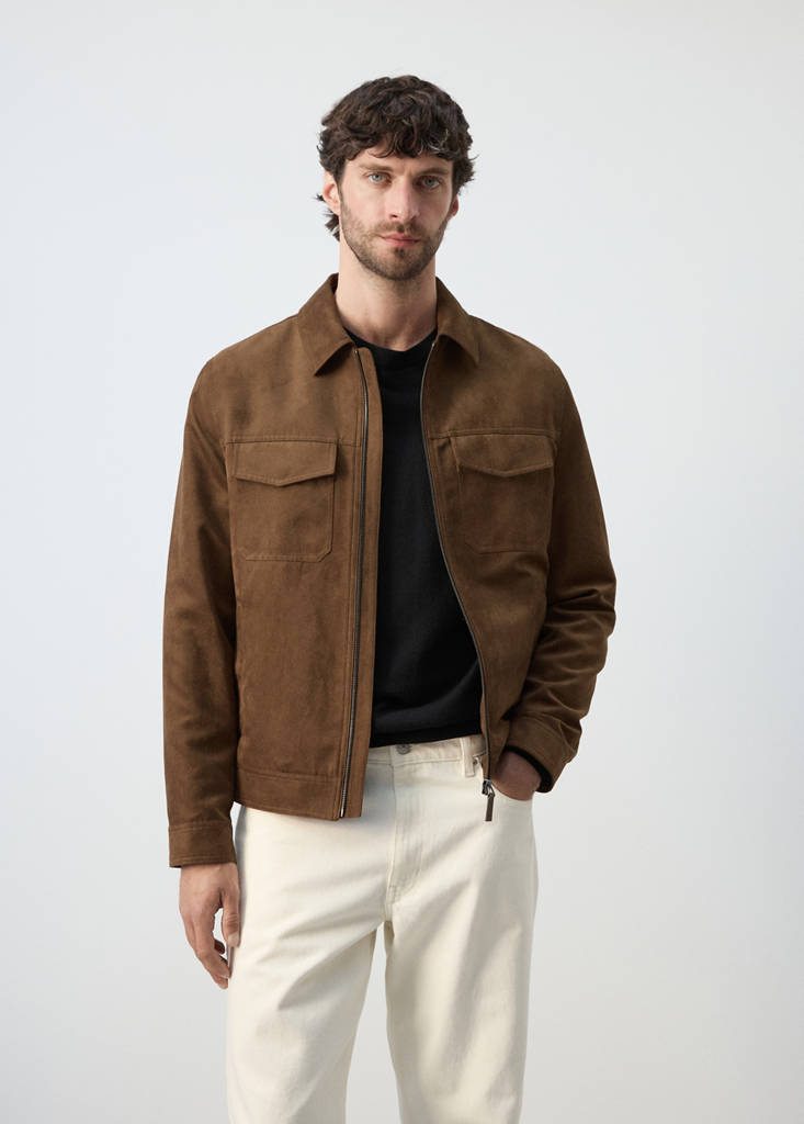 New NowSuede-effect jacket with pocketsCurrent price [PKR 22,990.00 ]PKR 22,990.00Select a colourCognacThe model is wearing size M and is 185cm tall.Select your sizeSMLXLXXLDimensionsAdd to WishlistSee lookFree delivery to storeFaux suede. Straight design. Shirt collar. Two side welt pockets. Two patch pockets with flaps on the chest. Zip closure. With inner liningDetails, composition and careStore availability