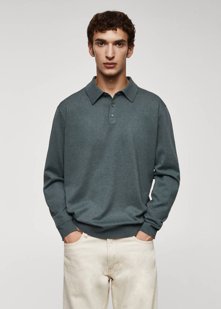Sustainable cotton fabric. Fine knit fabric. Polo collar. Long sleeves with elastic cuffs. Elastic ribbed endings. Straight hem. The ink blue and beige models are online exclusives. Button up. Long sleeves
