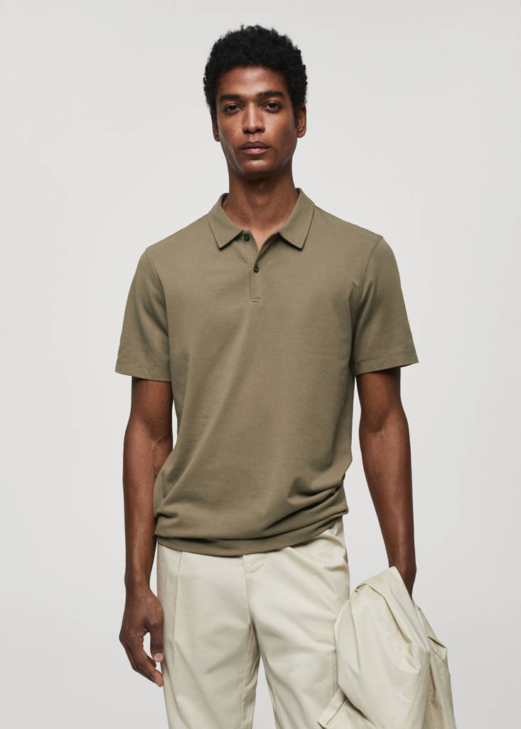 Khaki is an online exclusive. ESSENTIALS: Made to last. Slim fit. Cotton blend fabric. Polo collar. Button fastening at the neck. Short sleeves. Straight hem