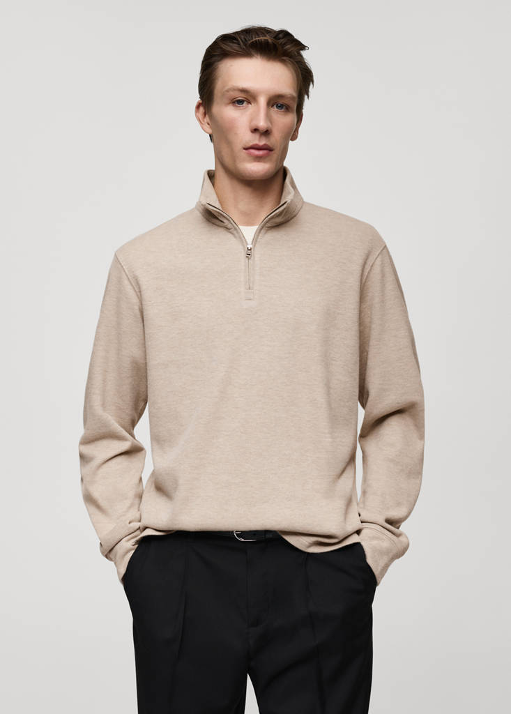 Recycled cotton and polyester blend fabric. Regular fit. Funnel neck with zip fastening. Long sleeves. Straight hem