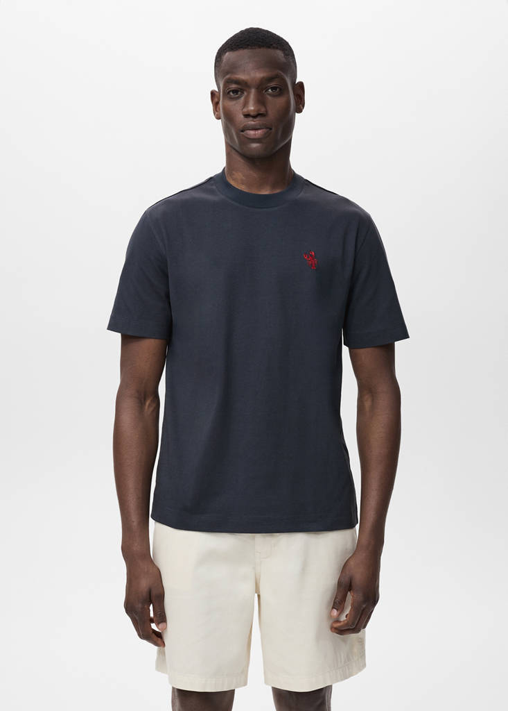 Crafted from 100% cotton fabric, this t-shirt features a regular fit with an embroidered lobster design on the chest. It has a crew neck, short sleeves, and a straight hem. The model is 190 cm tall and is wearing a size M
