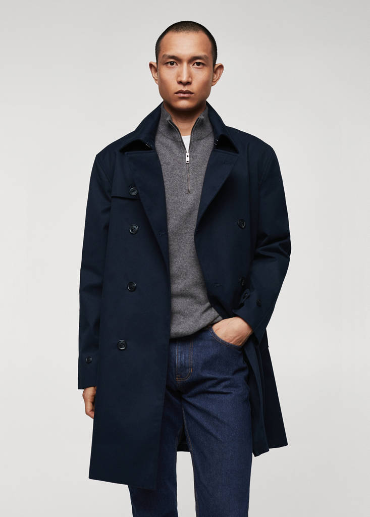Basics Collection. Cotton-blend fabric. Water-repellent: The durable finish of this garment protects against light rain, repelling contact with water and raindrops. Medium design. Loops on the shoulders. Lapel with notch. Long sleeve. Loops on the cuffs. Two side pockets. Loops on the waist. Removable belt at the waist. Double button fastening. Inner lining. Inner pocket. The model is wearing a size M