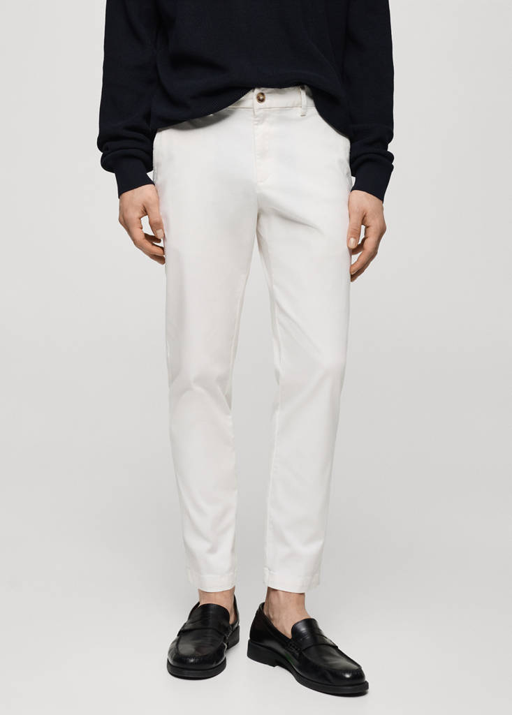Tapered fit: wide cut at the top that narrows from the knee to the ankle. Sustainable cotton blend fabric. Crop design. Chinos style. Belt loops. Soft elastic at front side waistband for added comfort and support the growing bump. Zip and button fastening. Two side pockets. Two pockets with buttoned flaps on the back. Belt loops. Basics Collection. Waist with adjustable inner cord. Coin pocket at hip height. The model is wearing a size 42. Cotton fabric. Side pockets. Coin pocket. Button and lace closure. Elasticated waistband. Elastic band. Lightweight fabric. Two front pockets. Cotton and polyester blend fabric. Slim fit. Floral print. Button up. Short sleeves. Classic collar