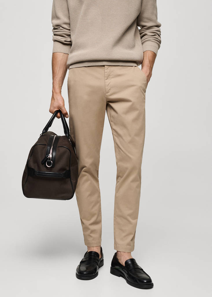 Tapered fit: wide cut at the top that narrows from the knee to the ankle. Sustainable cotton blend fabric. Crop design. Chinos style. Belt loops. Soft elastic at front side waistband for added comfort and support the growing bump. Zip and button fastening. Two side pockets. Two pockets with buttoned flaps on the back. Belt loops. Basics Collection. Waist with adjustable inner cord. Coin pocket at hip height. The model is wearing a size 42. Cotton fabric. Side pockets. Coin pocket. Button and lace closure. Elasticated waistband. Elastic band. Lightweight fabric. Two front pockets. Cotton and polyester blend fabric. Slim fit. Floral print. Button up. Short sleeves. Classic collar