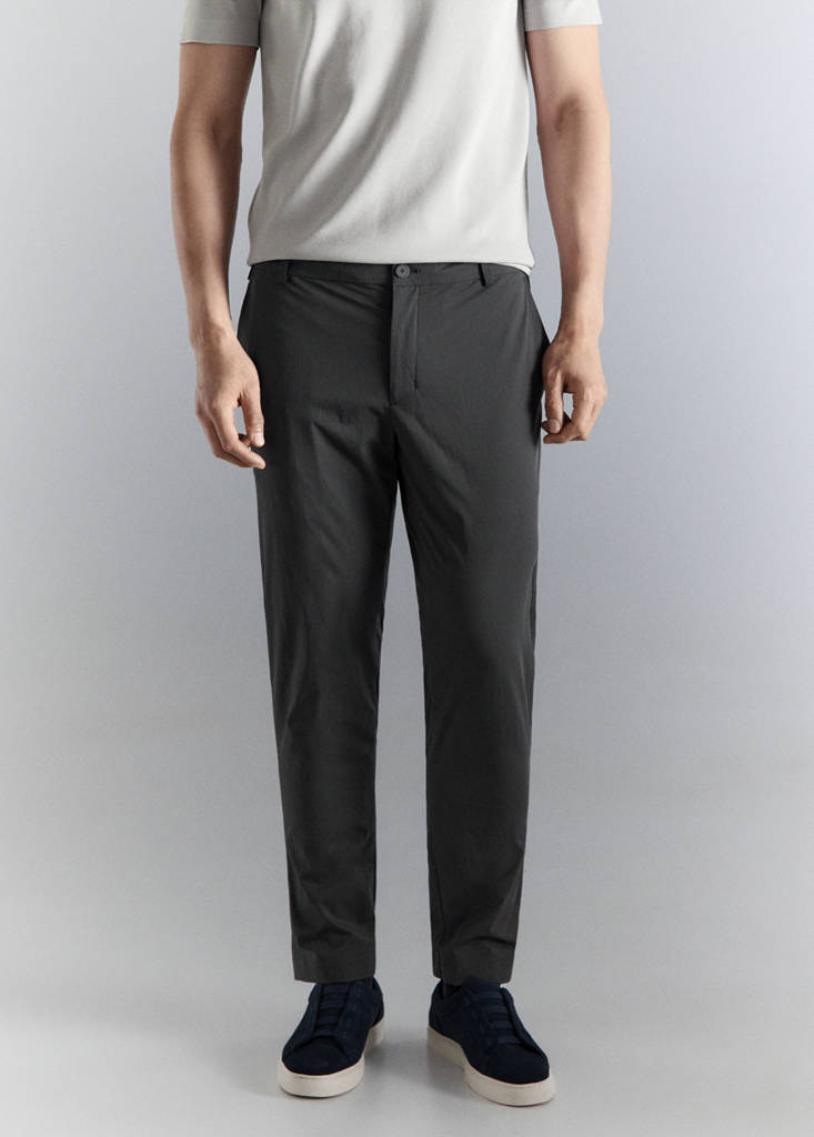 Performance Collection. Water-repellent: The durable finish of this garment protects against light rain, repelling contact with water and raindrops. Thermoregulating: This fabric offers optimal breathability to keep you at a stable temperature. Comfort Stretch: Stretch fabric for added comfort. Slim fit. Elastic waist with adjustable drawstring. Front fastening with double-breasted buttons and zip. Two front welt pockets. Two welt pockets with button at the back