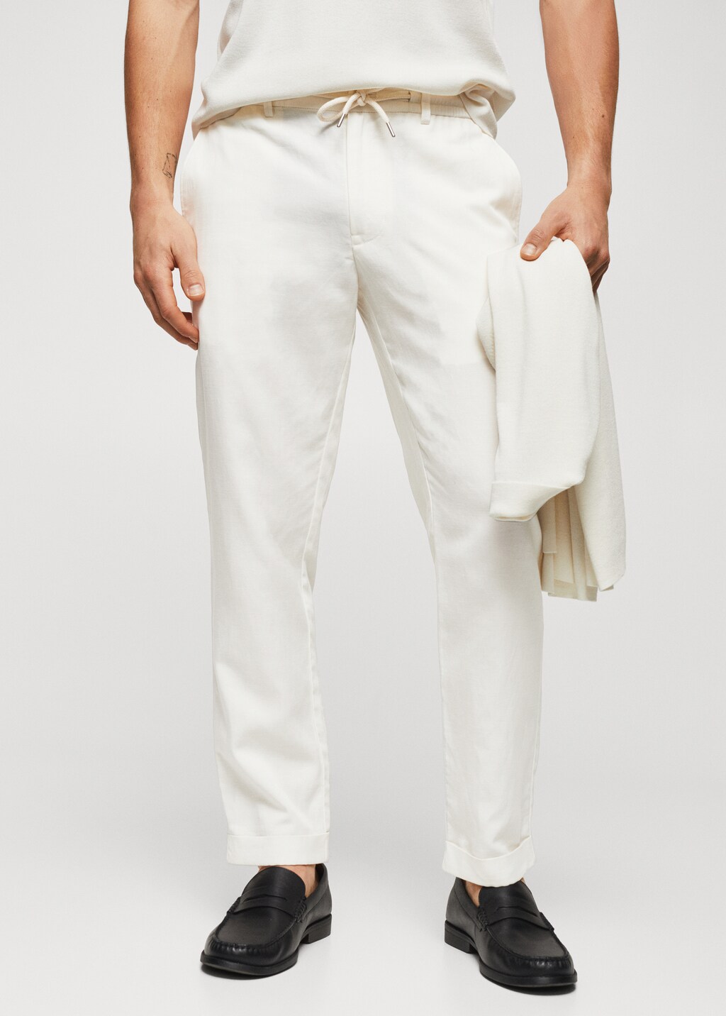 Slim fit. Linen and lyocell blend fabric. Flowy fabric. Elastic waist. Lanyard with option of visible or hidden knot on the inside. Elastic pleated on the waist. Double button and zip closure. Two side pockets. Two welt pockets on the back. Cuffed hem. Basics Collection. Antoine Griezmann Campaign.