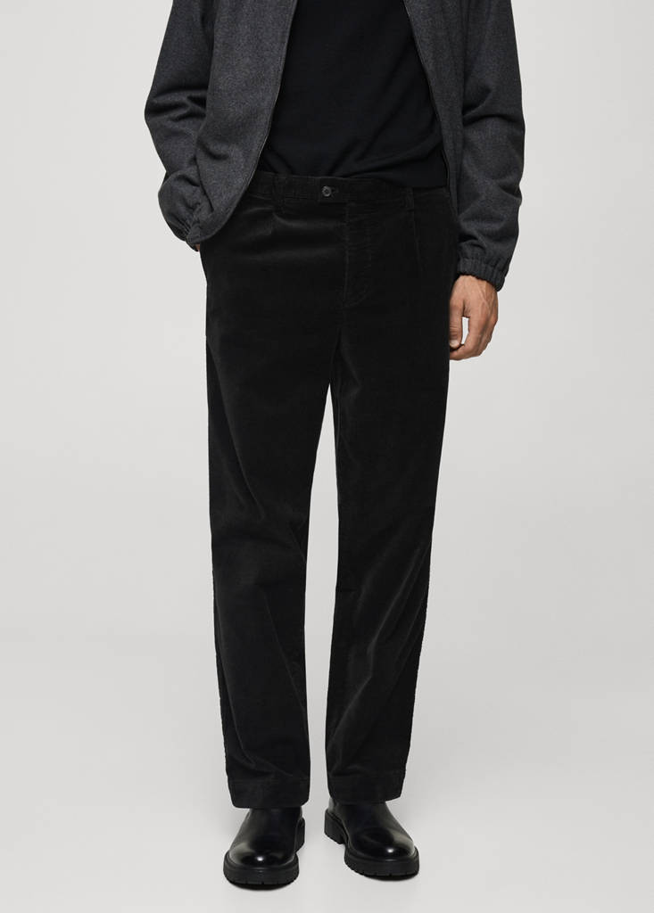 Corduroy fabric. Mid-rise. Cotton blend fabric. Double button and zip closure. Belt loops. Front pleat detail. Two front pockets. Two pockets with buttoned flaps on the back. Straight hem. The brown and black models are online exclusives. Straight-fit