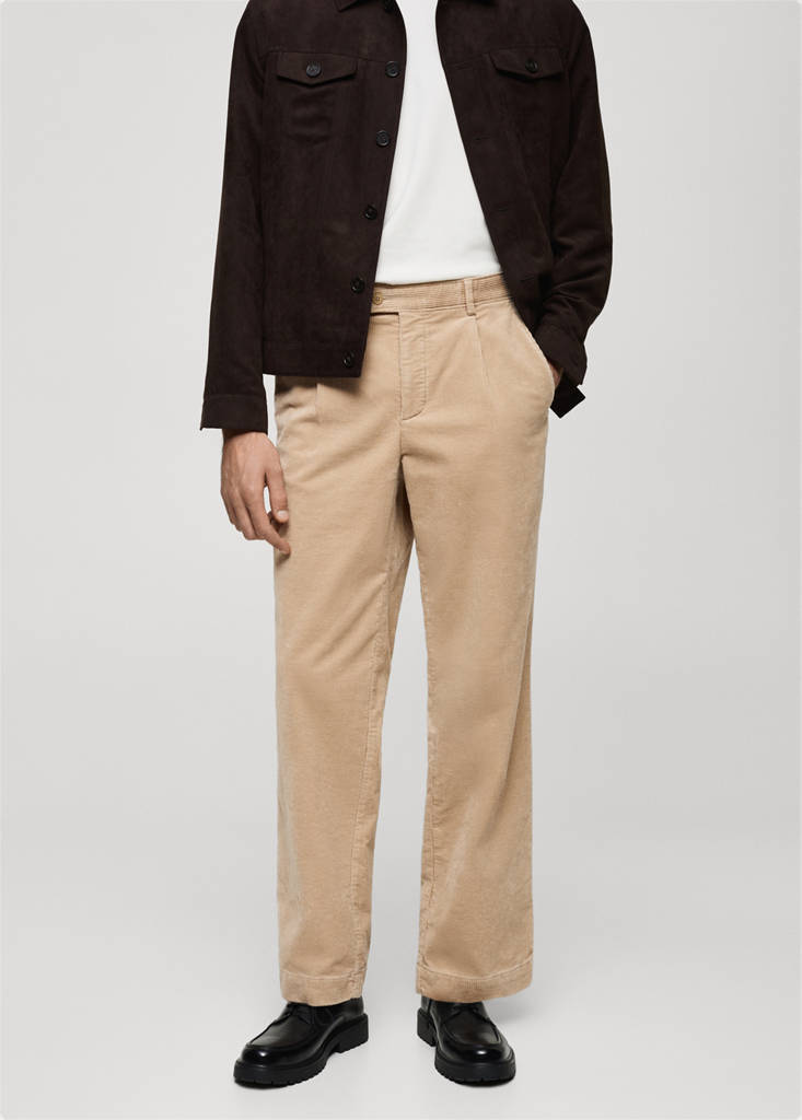 Corduroy fabric. Mid-rise. Cotton blend fabric. Double button and zip closure. Belt loops. Front pleat detail. Two front pockets. Two pockets with buttoned flaps on the back. Straight hem. The brown and black models are online exclusives. Straight-fit