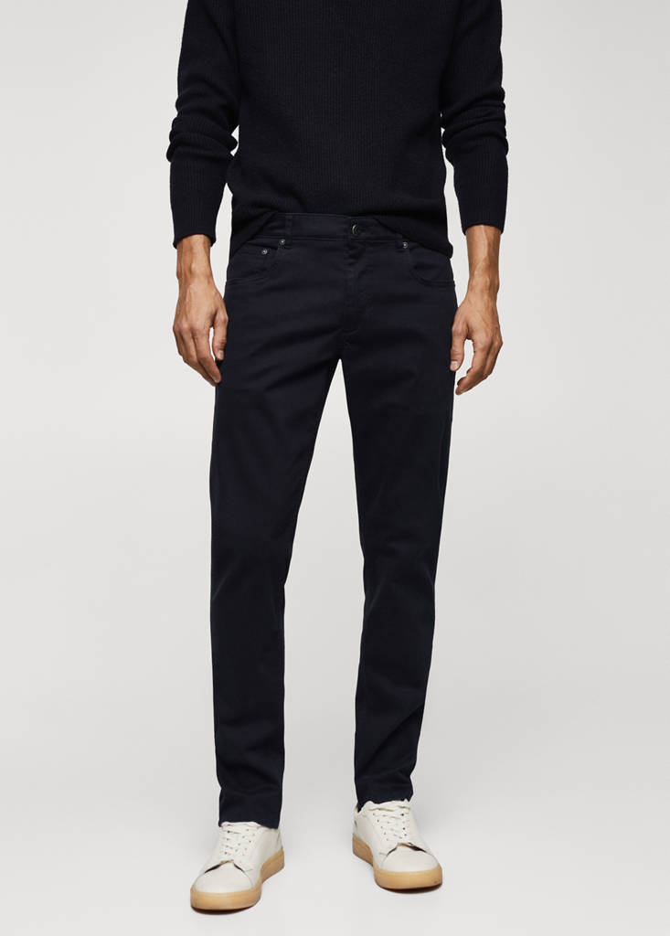 Slim fit. Slightly elastic cotton fabric. Mid-rise. Five pockets. Elasticated waistband. Zip and button fastening. Belt loops. Two front pockets. Coin pocket. Two patch pockets at the back