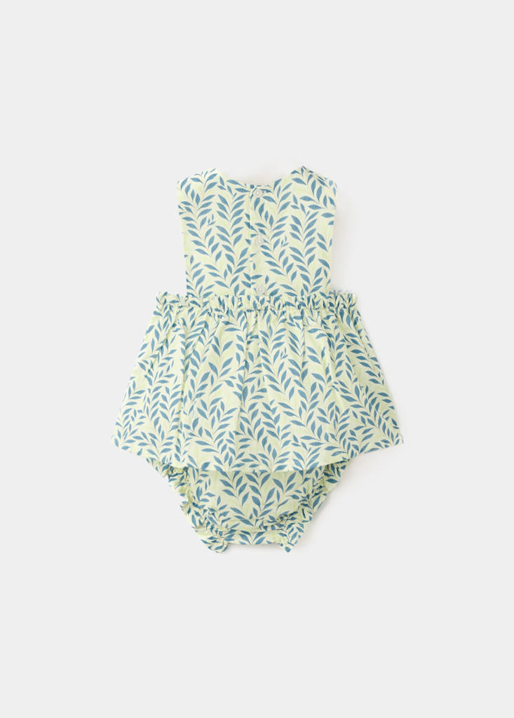 100% cotton fabric. Printed design. Two-tone design. Round neck. Sleeveless. Elasticated waist. Ruffled ends. Button fastening on the back section