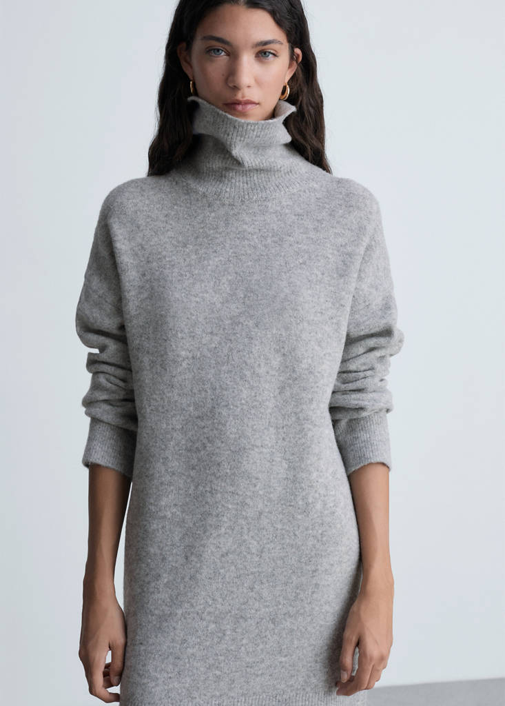 Knitted turtleneck dressCurrent price [PKR 14,490.00 ]PKR 14,490.00Select a colourMedium Heather GreySelect your sizeXXSXSSMLXLXXL1XL2XL3XL4XLSize guideAdd to WishlistSee lookFree delivery to storeSee availability in storeDescriptionMidpoint. Short design. Straight design. Roll neck. Long sleeves.See detailsShare