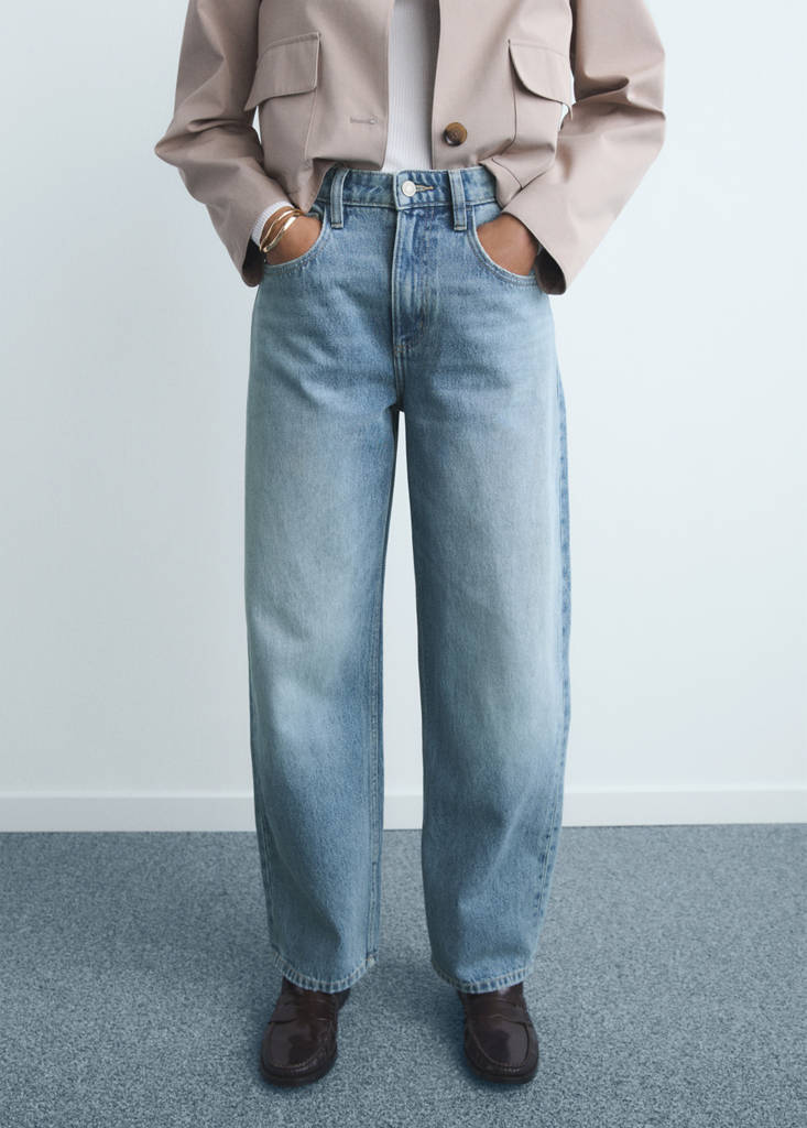 Denim-style cotton fabric. Long design. Balloon Design. Barrel style. High waist. Belt loops. Five pockets. Front zipper and button closure. Inside length 75 cm.