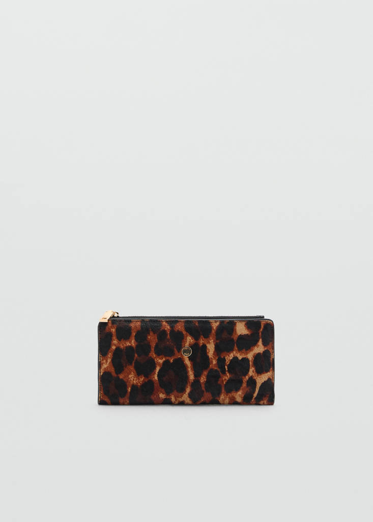 Large. Faux fur fabric. Bovine hide. Leopard print. Animal print. Multiple card slots. Inner zipped pocket. Inside magnet fastening. Inner lining