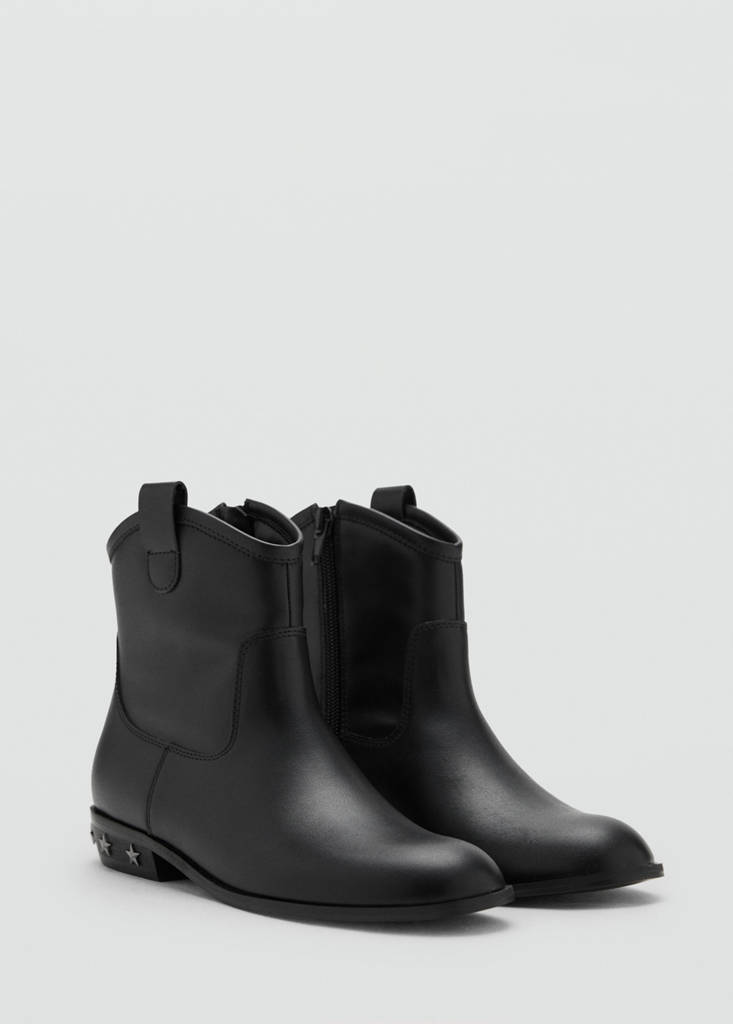 Tkanina ze sztucznej skóry. Efekt skóry. Ćwieki w kształcie gwiazdy. Półokrągły, wąski nosek. Zamek błyskawiczny. Powrót do szkoły