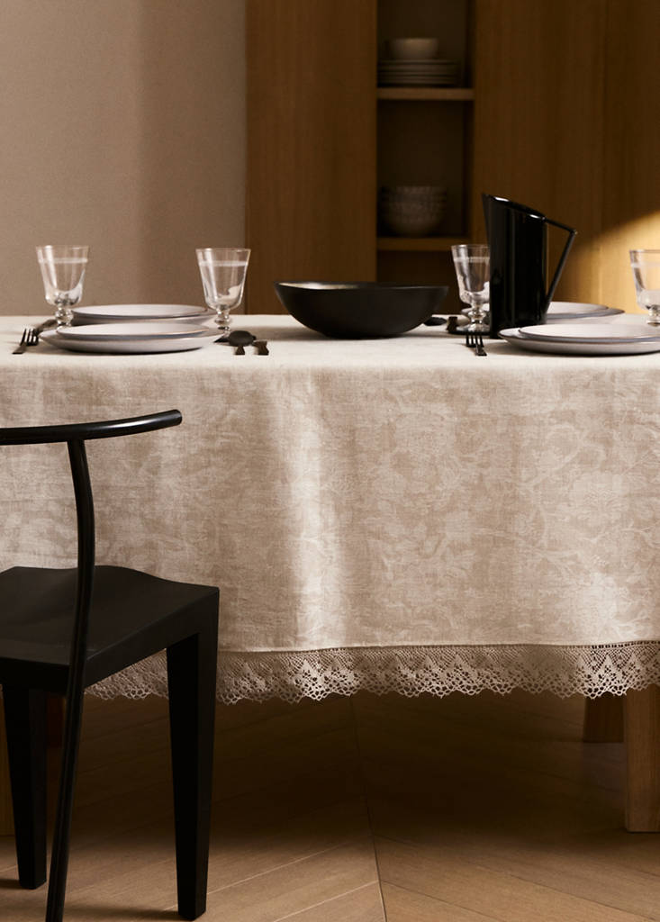 Obrus z lnianego żakardu w kwiaty z koronkową tasiemką dla 6-8 osób