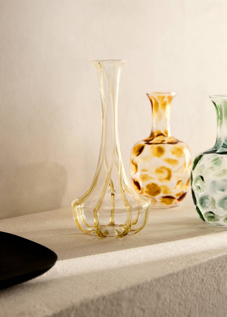 100% szkło borokrzemowe. Średnica: 10 cm; Wysokość: 21,6 cm; Podstawa: 6 cm. Przezroczysty design. Materiały wysokiej jakości i trwałe. Wzór w paski. Bulwiasta podstawa ze zwężająca się szyjką z otworem u góry. Idealna do łączenia z różnymi stylami dekoracyjnymi. Dodaj wyjątkowy i kolorowy akcent do każdej przestrzeni. Pasuje do innych produktów z kolekcji. Dostępne w różnych kolorach