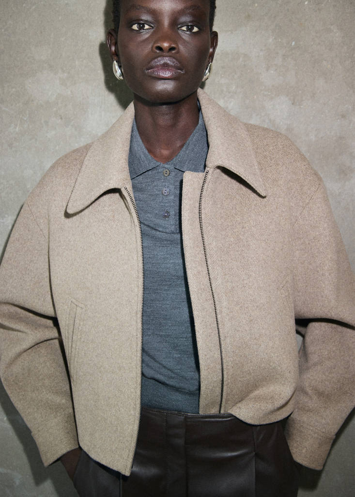 Tkanina mieszanka wełny. Projekt krótki. Prosty krój. Kołnierz koszulowy. Długi rękaw z mankietami zapinanymi na guziki. Dwie boczne kieszenie. Zamek błyskawiczny. Podszewka wewnętrzna