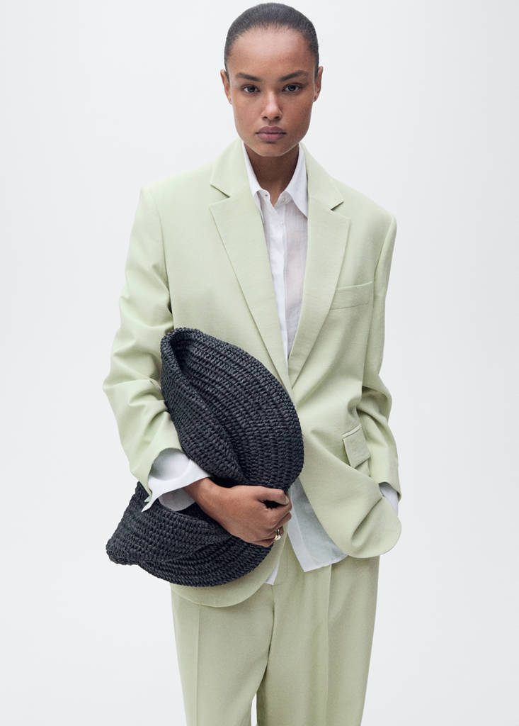 Styl garnitur. Dekolt w szpic z kołnierzykiem. Klapki z nacięciem. Długi rękaw z mankietami zapinanymi na guziki. Kieszeń z lamówką na piersi. Dwie kieszenie boczne z patką. Rozcięcie z tyłu na dole. Zapięcie na guziki z przodu. Total look