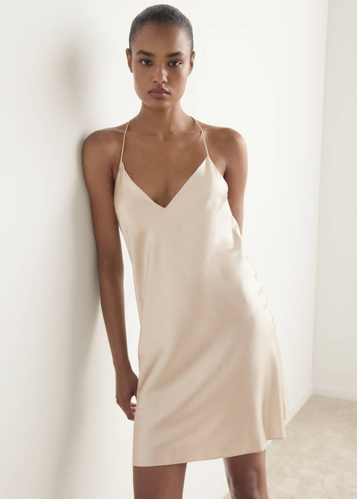 Jedwabna tkanina. Cienkie ramiączka. Projekt krótki. Dekolt w serek. Lekka tkanina z satynowym wykończeniem. Plecy z dekoltem i krzyżowymi ramiączkami. Zapewnia komfort i swobodę ruchu. 100% jedwab. Cienkie ramiączka skrzyżowane na plecach. Przyjemna tekstura. Pasuje do innych produktów z kolekcji