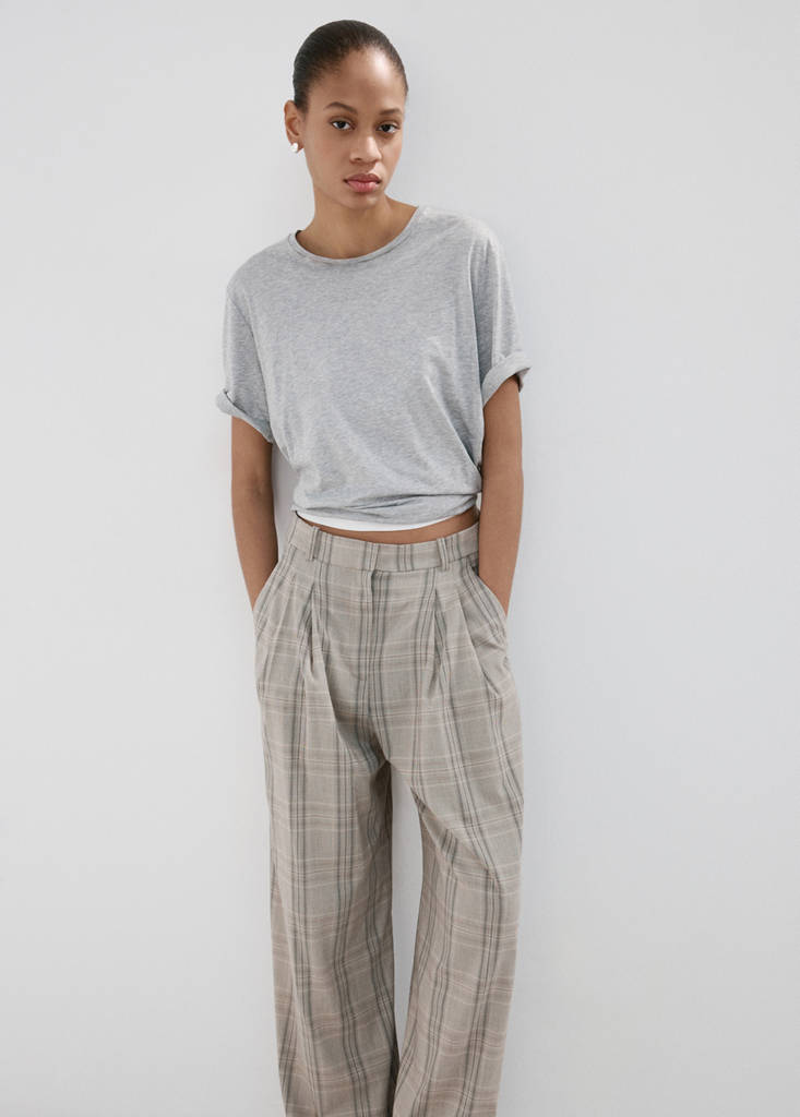 Prosty krój. Długi fason. Detal z zakładkami. Nadruk w kratę. Szlufki. Średni stan. Dwie boczne kieszenie. Kryte zapięcie na guzik, haftkę i suwak. Podszewka wewnętrzna