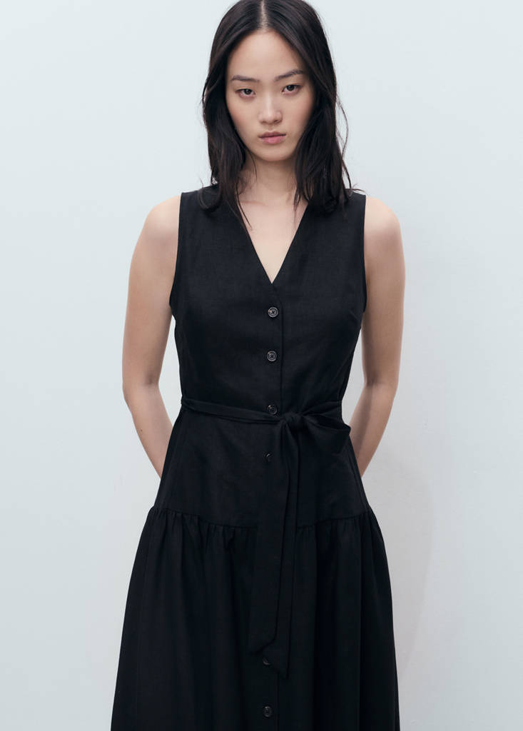 Tkanina z domieszką lnu. Krój midi. Krój trapezowy. Dekolt w serek. Bez rękawów. Szerokie ramiączka. Szlufki. Odpinany pasek. Zapięcie na guziki z przodu. Dostępne Plus