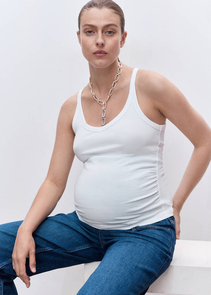 Ten top dla kobiet w ciąży wykonany z bawełnianej tkaniny ma prosty i dopasowany krój. Jego dekolt w serek i szerokie ramiączka zapewniają wygodę i styl. Dostępny wyłącznie online