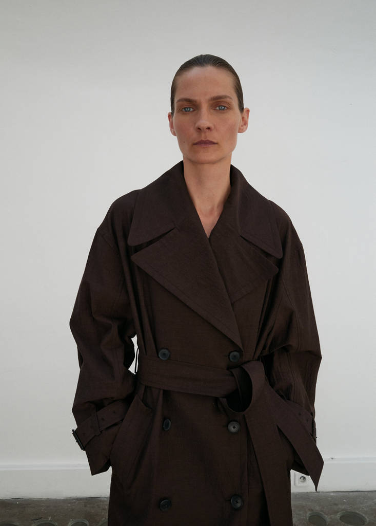 Ten długi model o prostym kroju, wykonany z wełny dziewiczej, ma dekolt w serek z klapami z wycięciem, długie rękawy z mankietem zapinanym na guziki, pasek, dwie boczne kieszenie, dwurzędowe zapięcie oraz podszewkę. Kolekcja Selection
