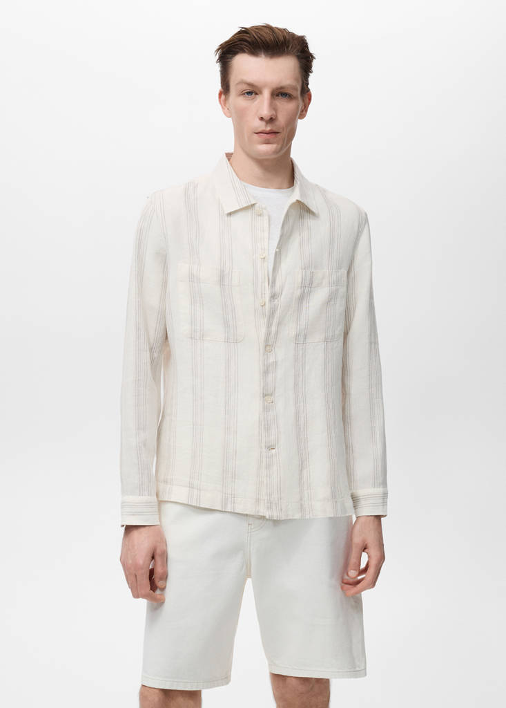 100% Len. Regularny krój. Kołnierz koszulowy. Zapięcie na guziki z przodu. Dwie kieszenie na piersi. Szczegóły zaszewek z tyłu. Mankiety zapinane na guziki. Prosty dół. Dostępny zestaw total look. Produkt w promocji