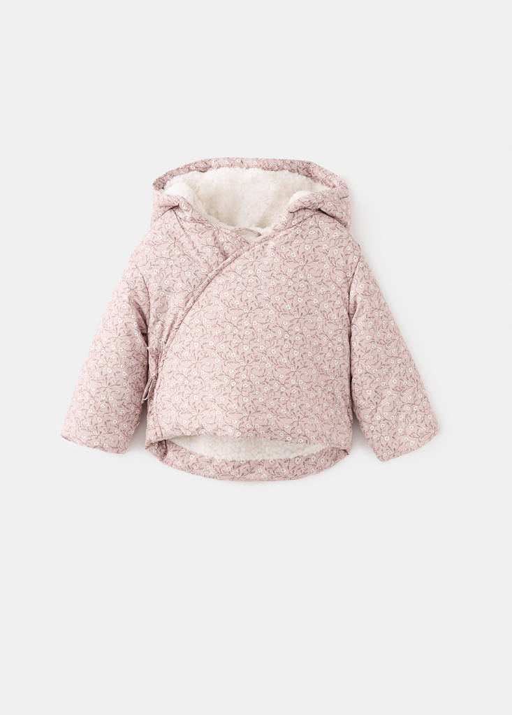 Materiał pikowany. Futrzana podszewka z baranka. Wzór kwiatowy. Sznurek wiązany na krzyż. Z kapturem. Długi rękaw