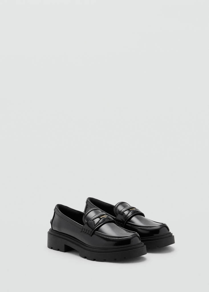 Mokasyny. Efekt skóry. Półokrągły, wąski nosek. Moneta wewnątrz maski. Podeszwa z ząbkowanej gumy