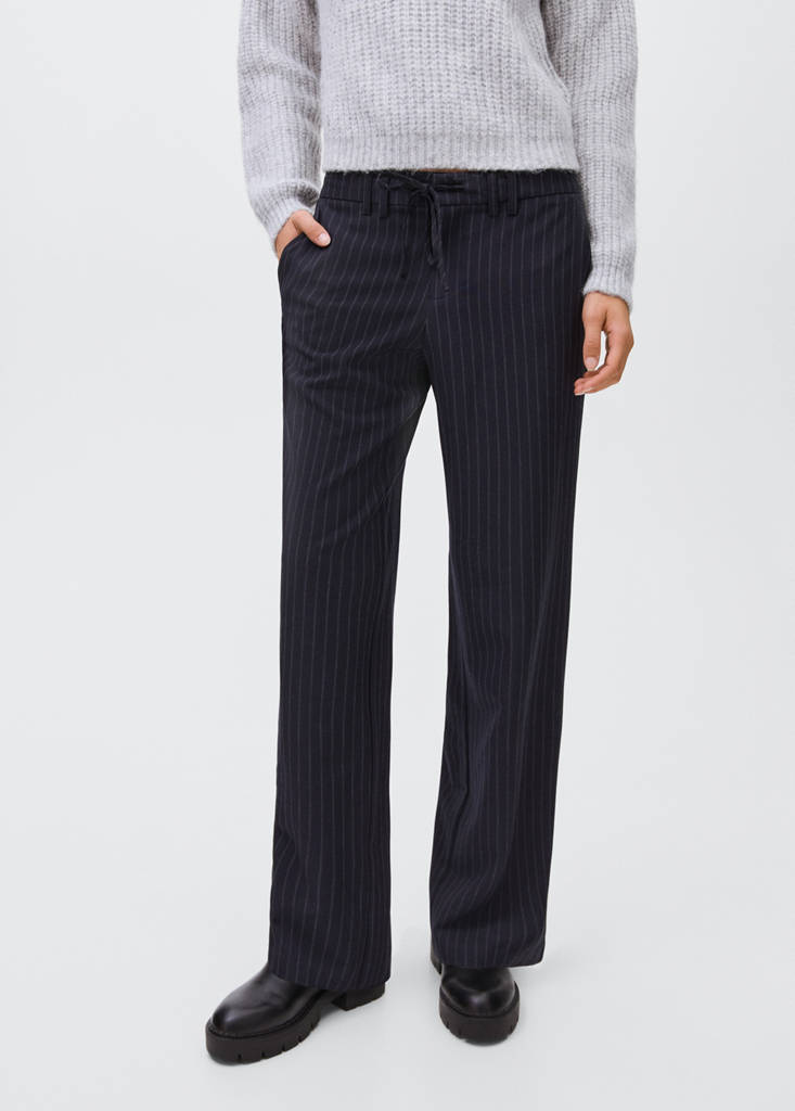 Ten długi model w stylu garnituru z tkaniny w paski ma elastyczną talię ze sznurkiem zapewniającym większy komfort oraz dwie boczne kieszenie, które dodają mu funkcjonalnego charakteru