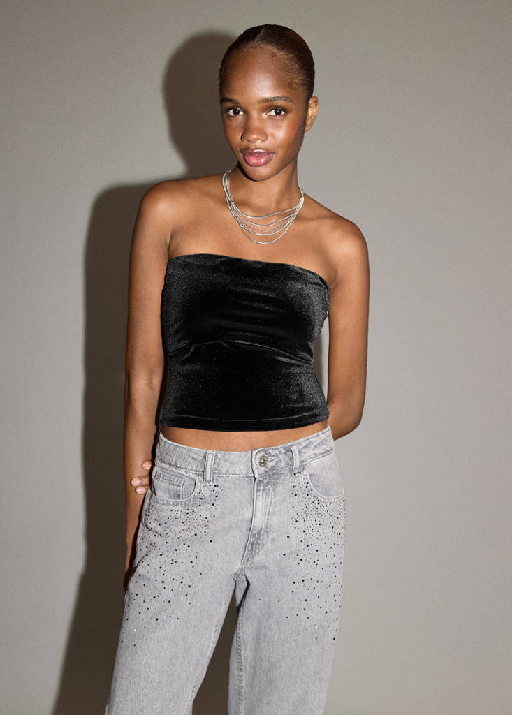 Standardowa Długość. Sylwetka Prosta. Płaska struktura Lekki. Dekolt z odkrytymi ramionami. Tkanina z weluru. Krój crop. Projekt dopasowany. Dekolt typu hiszpanka. Kolekcja na przyjęcia i wydarzenia. Party Collection. Kolekcja Świąteczna. Błyszczący materiał