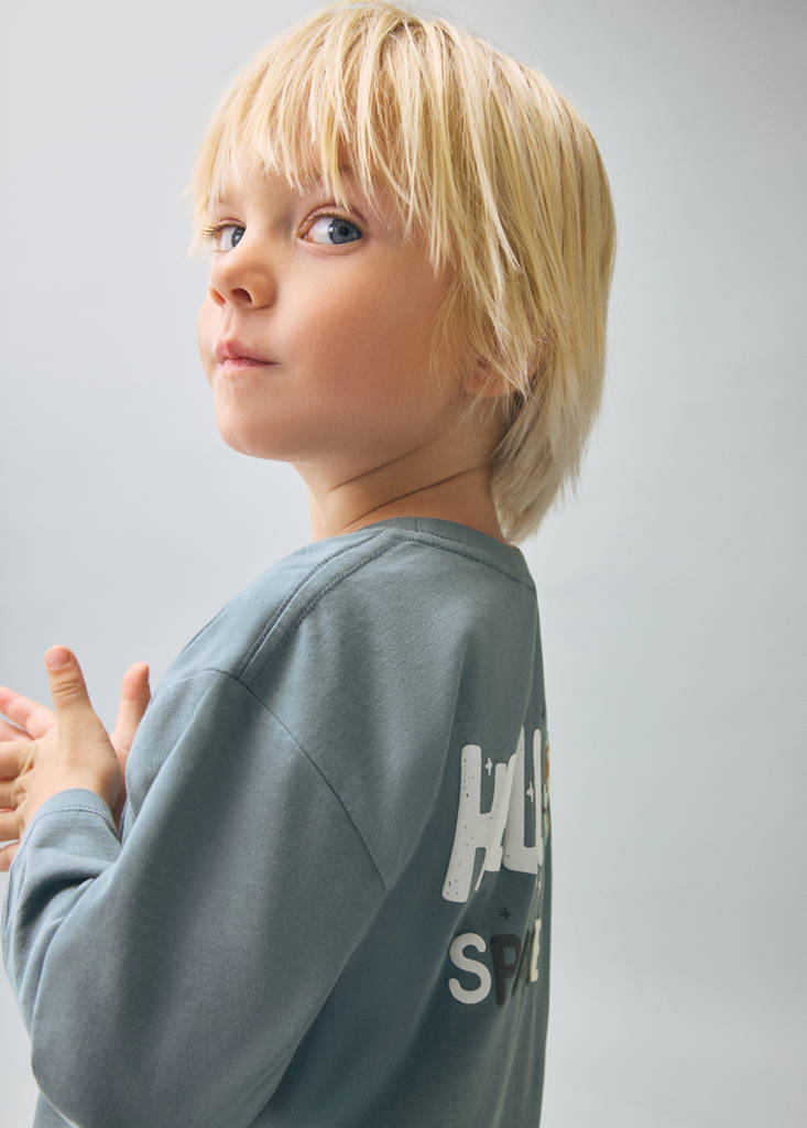 Tecido 100% algodão. Design reto. Design estampado. Desenho estampado na parte da frente. Desenho estampado com relevo na parte traseira. Gola redonda. Manga comprida