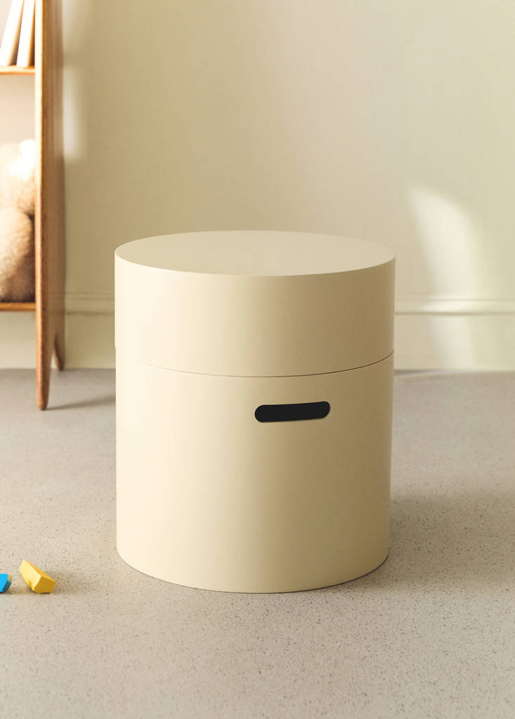100% madeira. Diâmetro: 30 cm. Altura: 35 cm. Tampa de madeira. Asa retangular. Combina estética com funcionalidade. Ideal para guardar mantas ou outros acessórios de casa