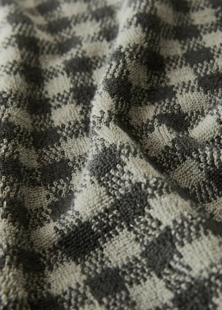 100% Algodão. Gramagem: 500gr/m2. Tamanho: 30x50cm. Estampado xadrez bicolor com overlock em contraste. De grande absorção e respirável para uma secagem rápida. Combina com mais produtos da coleção