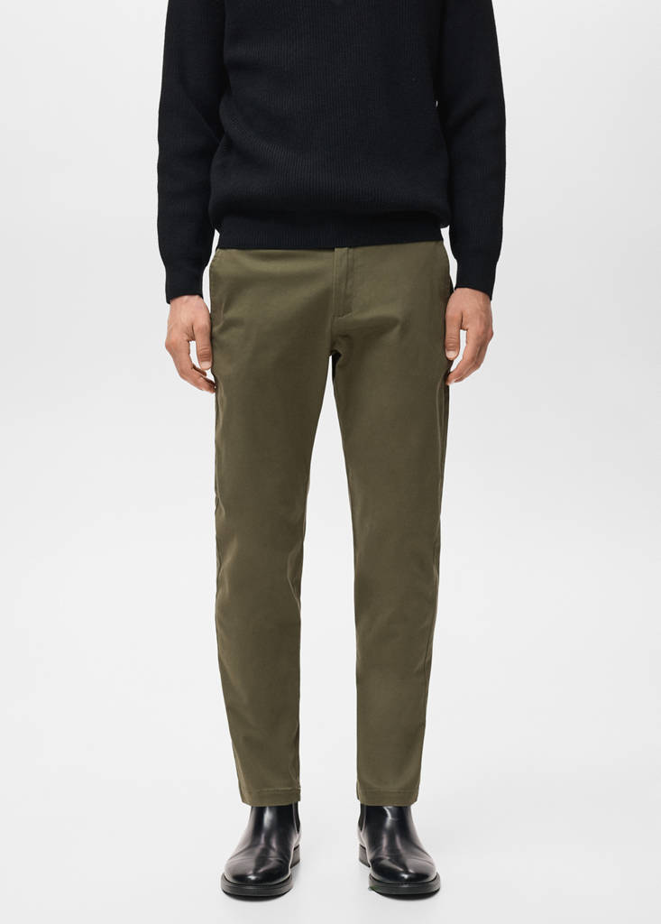 Estilo chino. Tapered fit: corte largo na parte superior que se afunila do joelho ao tornozelo. Tecido de algodão. Presilhas para cinto. Cintura com cordão interno ajustável. Fecho de zíper e botão. Faixa de malha elástica na cintura para maior conforto e apoio. Bolso porta-moedas à altura da anca. Dois bolsos frontais. Dois bolsos de aba com botão atrás. Comprimento Standard. Silhueta Slim. Cintura Regular Waist