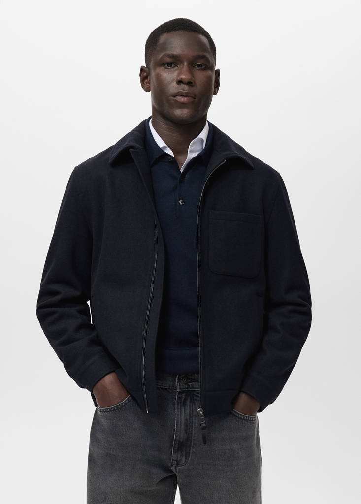 Silhueta reta. Tecido mistura de lã. Gola de camisa. Bolso de aplicação no peito. Dois bolsos laterais de debrum. Bolso interior. Fecho de correr à frente. Manga comprida com punhos abotoados