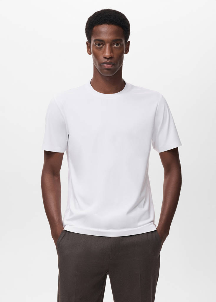 Slim fit. Tecido com viscose. Wrinkle free: tecido resistente aos vincos. Termorregulador. Comfort Stretch: tecido elástico que proporciona um extra de conforto. Coolmax® é um tecido especial que ajuda a repelir a humidade da pele, o que, em climas frios, permite manter o corpo seco e quente; em climas quentes, destaca-se pela sua leveza e frescura. Gola redonda. Manga curta termosselada. Abertura dupla na parte de trás