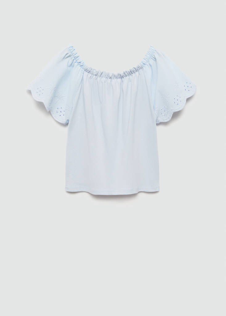 Tecido com algodão. Gola enrugada. Pormenores elásticos. Design reto. Manga curta. Detalhes bordados. Pormenores rendados. Desenho de palmeiras