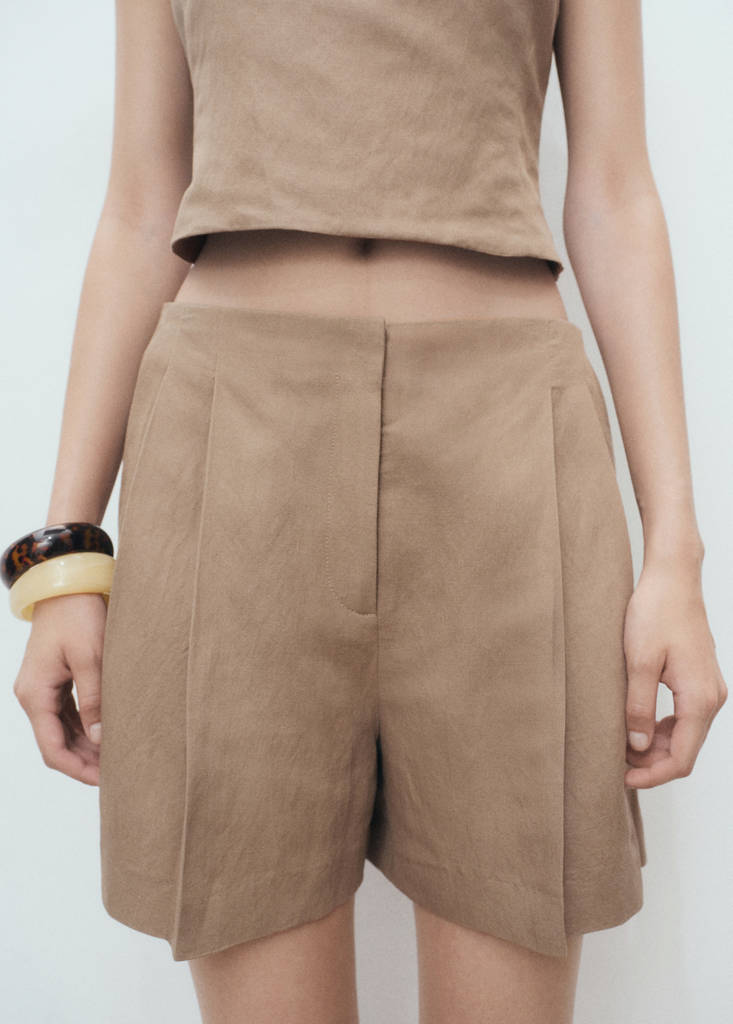 Confecionadas com uma mistura de linho, estes calções curtos com estilo de fato apresentam um cintura média. A cintura sem costuras e o pormenor das pregas conferem elegância. Incluem dois bolsos aos lados e dois de debrum na parte de trás. O fecho de correr com colchete garante um ajuste perfeito, enquanto o forro interior de 100% algodão proporciona conforto. Combine com o 'top' a condizer para criar um 'total look'