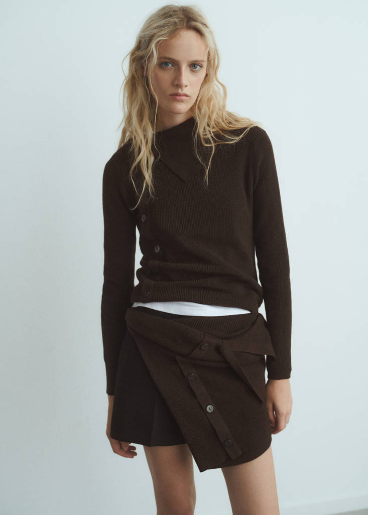 Confecionada com um tecido de malha fina, esta peça de corte justo apresenta uma elegante gola assimétrica e manga comprida. Os botões laterais dão um toque distintivo à peça