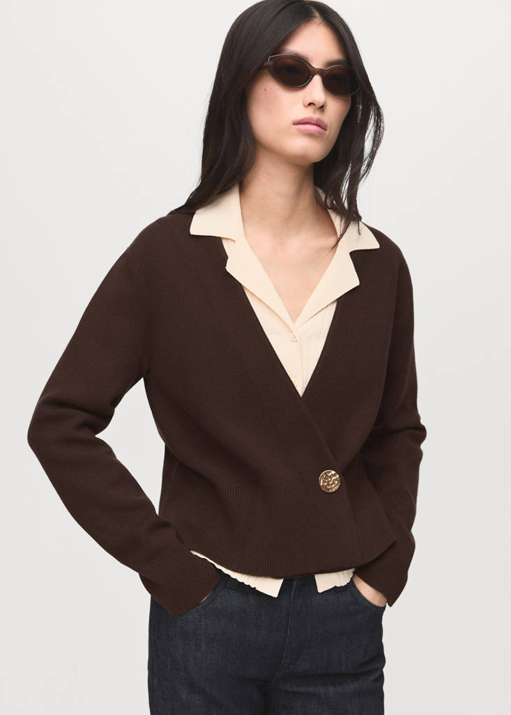 Confecionada com um tecido de malha, esta peça cruzado apresenta uma elegante gola em V e manga comprida. O fecho de botão dá-lhe funcionalidade e estilo