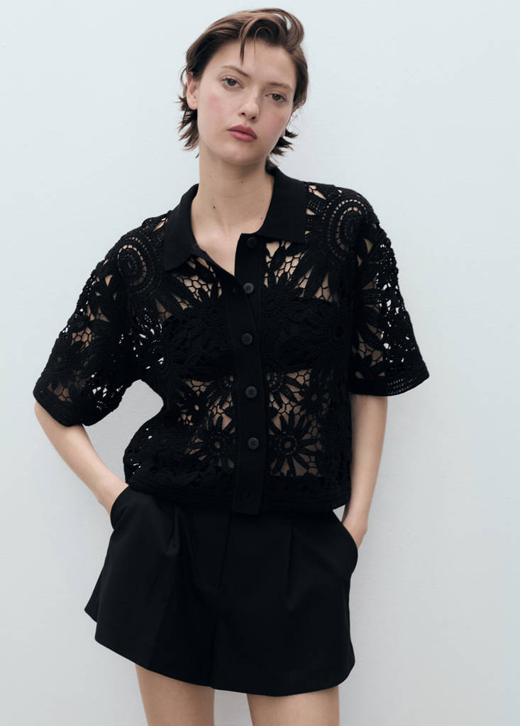 Tecido misto de algodão. Malha de tricô. Modelo de croché. Design reto. Gola de camisa. Manga curta. Fecho frontal com botões
