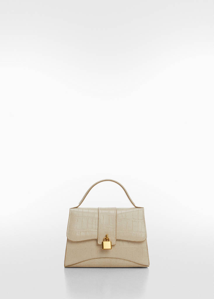 Tamanho pequeno, efeito de pele de crocodilo, alça comprida de corrente, pormenor de cadeado, forro interior.