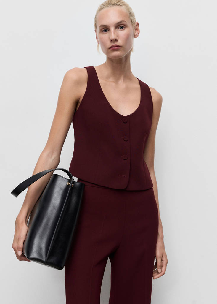Estilo fato. Design reto. Gola redonda aberta. Sem mangas. Alças largas. Fecho de botões na parte da frente. Forro interior. Disponível Plus. Total look