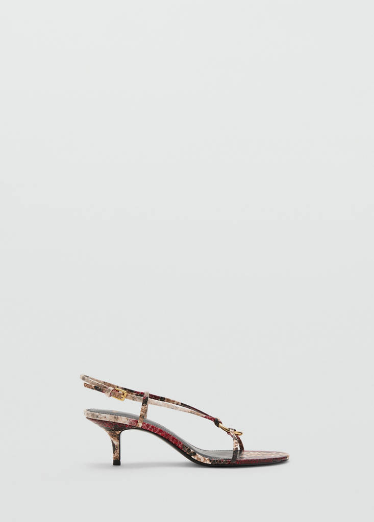 Desenho de tiras. Biqueira aberta. Argola decorativa. Salto kitten. O salto mede 5 cm. Fecho de fivela no tornozelo. O estampado animal só está disponível 'online'