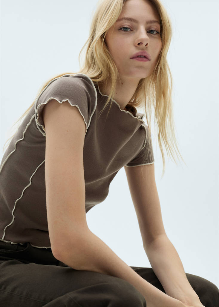 T-shirt cropped com debruns em contrastePreço atual [12,99 € ]12,99 €Selecione uma corCastanho-médioSelecione o seu tamanhoXXSNão disponível. Quero!XSNão disponível. Quero!SNão disponível. Quero!MNão disponível. Quero!LNão disponível. Quero!XLNão disponível. Quero!XXLNão disponível. Quero!MedidasAvisem-meAdicionar a PreferidosVer lookEnvio gratuito para a lojaComprimento Standard. Estrutura plana Leve. Silhueta Slim. Gola com lapela Redonda. Comprimento manga CurtaPormenores, composição e cuidados a terDisponibilidade em lojaMango StylistPergunte sobre envios, devoluções e muito maisAssistantQualidades do artigoAlgodão recicladoNo mínimo 20%Esta fibra é obtida a partir de resíduos têxteis de pré e pós-consumo, que são transformados em novos tecidos.