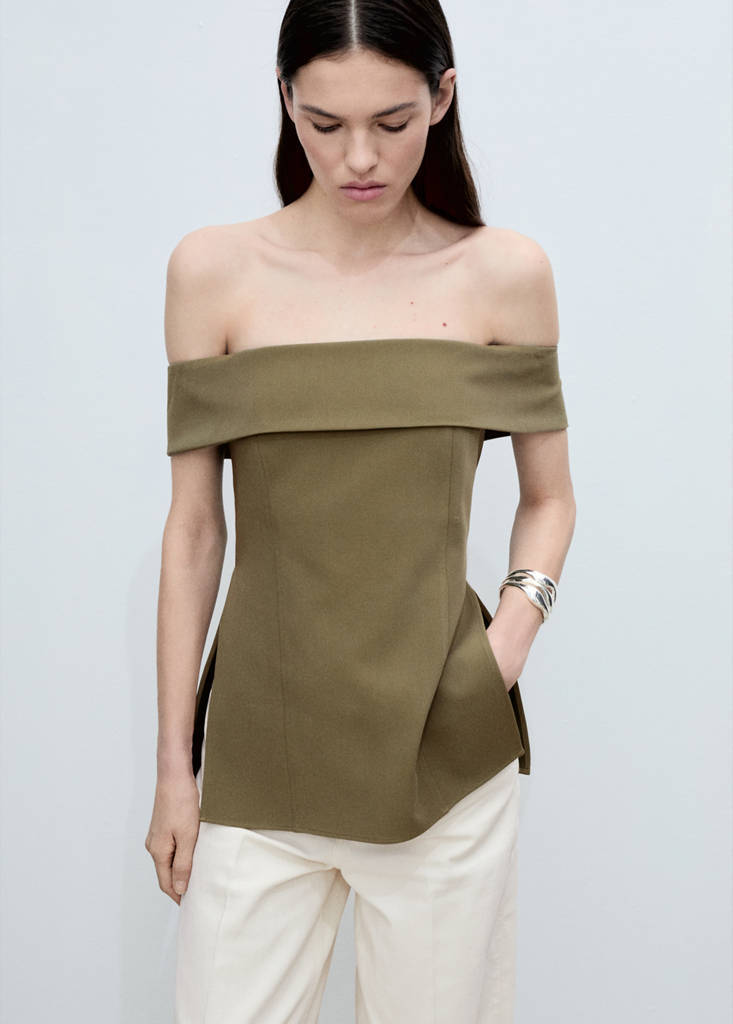 Design ajustado. Decote cai-cai. Ombros descobertos. Gola com dobra. Sem mangas. Fecho de correr na parte posterior. Forro interior