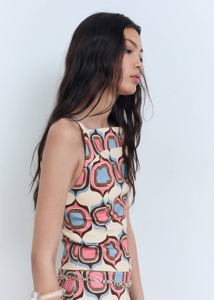 Tecido de algodão. Design reto. Estampado geométrico. Gola barco. Sem mangas. Alças largas. Fecho de correr na parte posterior. Total look