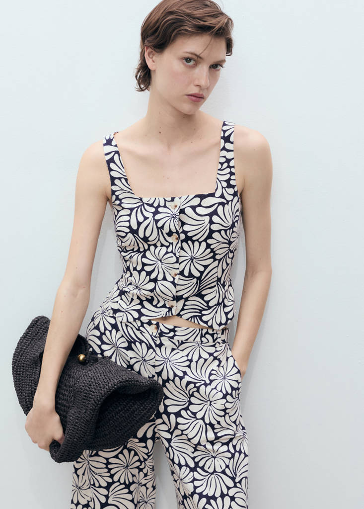 Tecido com mistura de linho. Design ajustado. Estampa de flores. Decote profundo. Sem mangas. Alças largas. Fecho de botões na parte da frente. Total look